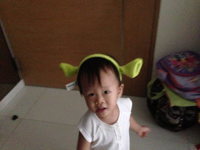 I love it when they are at this age cos I can TOTALLY do anything I want to them, even if its for just 3 minutes before they get irritated & yank it off. So there I have it, my ultra cute baby Shrek!